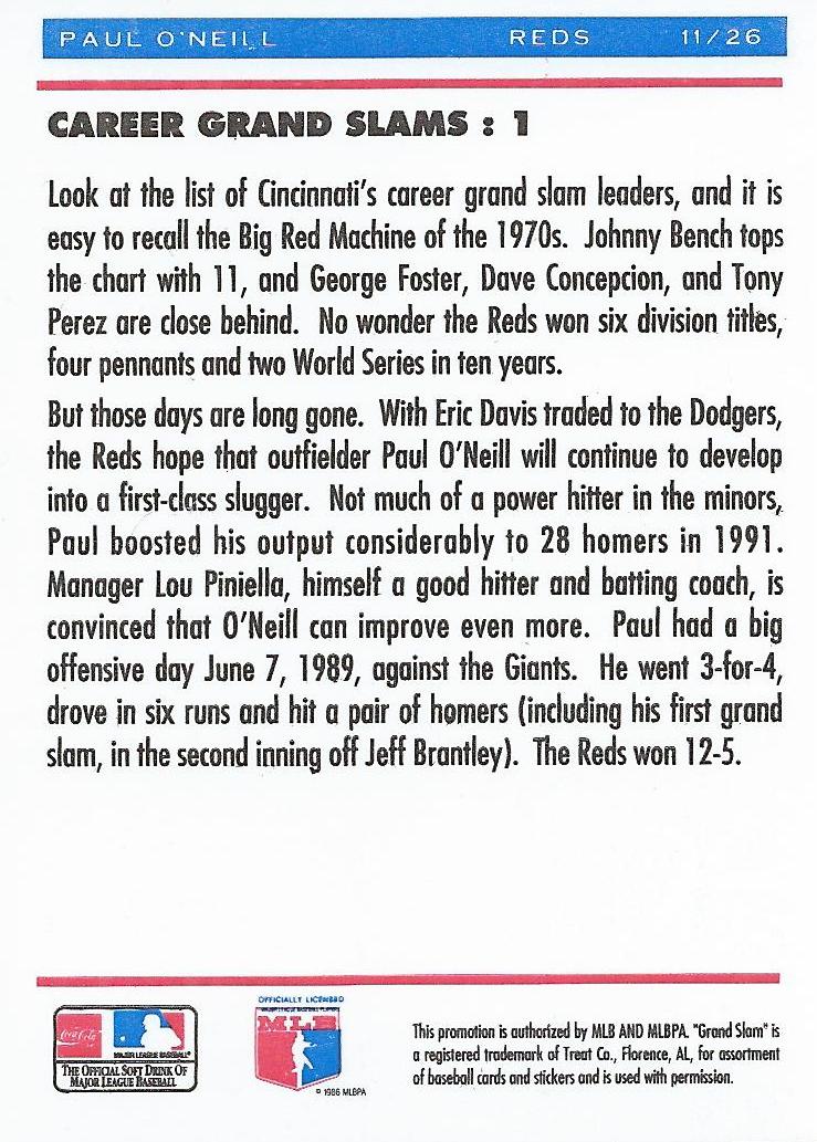 The backs are much more subdued as they start with the player and team names again in a horizontal blue bar that also includes the card number--and the total number of cards in the set, a feature I tend to like in my sets, though it's so rarely used. The main focus here is grand slams so we're told in BOLD CAPS how many that player's hit, then given a write-up on him and why he's in the set. This is all contained on a bright white back in between a couple red bars, making this a set Hulk Hogan and other Real Americans could be proud of.