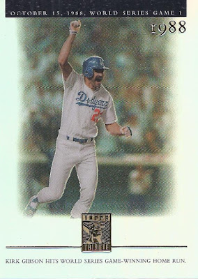 Two of these three may feature Gibby with the Dodgers, but that's cool since a few sets occasionally remember 1988's game 1. Card #1 from UD's fun Piece of History product highlights Kirk's 1988 regular season NL MVP award, which he won over the Mets' Darryl Strawberry by a decent number of points thanks to this stat line: .290/.377/.483 with 25 HR, 76 RBI, 106 R, and 31 SB.Number two hails from Topps' typically beautiful and high-end Tribute set, this one a World Series-themed product. It features one of the game's most iconic shots of Gibby celebrating his famous homer. I need to track down his earlier card from this set which includes him with the '84 Tigers.