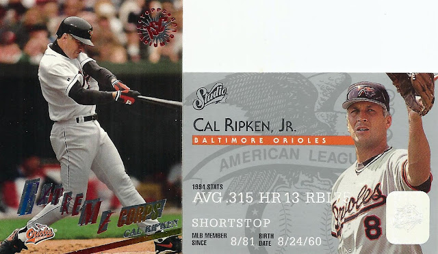 I always enjoy digging out fun 90s inserts of some of my PC superstars, and happily, Cal Ripken Jr. (405 cards) made a couple appearances this time. The card on the left is an Extreme Corps subset from '95 Stadium Club. Remember the 90s, when everything was EXTREME? To the right is my third example from '95 Studio, in this case Cal's base card. Like his fellow Junior, Cal had a pretty nice '94 season considering its brevity.