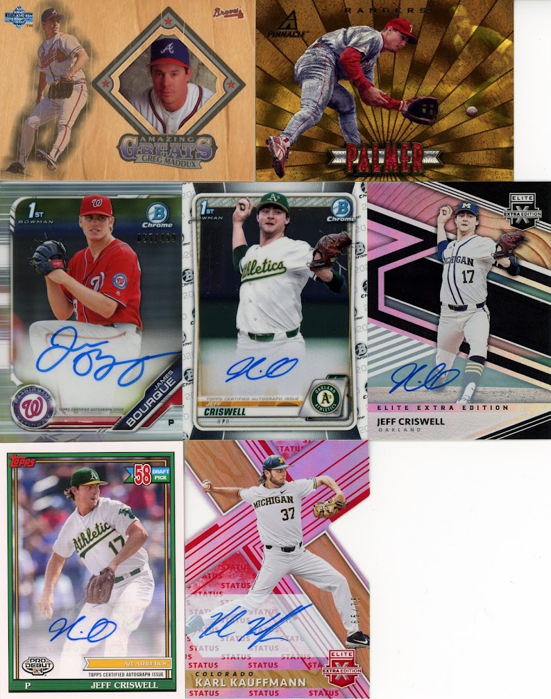 To those I added a five-pack of ex-UM pitcher autos, all of which I believe were less than $2.50. Bourque's is a Refractor of the only other hit I owned of him, and that's numbered /499. New Rockie Jeff Criswell gets a nice trio added to his total out of Bowman Chrome, Elite, and Topps Pro Debut, and of course the middle card is my favorite since it features a college uniform photo. He now has four such cards to his name in my collection. And I ended up with a single card, but a spiffy one, of Criswell's potential Colorado teammate, Karl Kauffmann, also from Elite. It's a Status die-cut parallel numbered /99 and gives him four autos also out of six total hits.