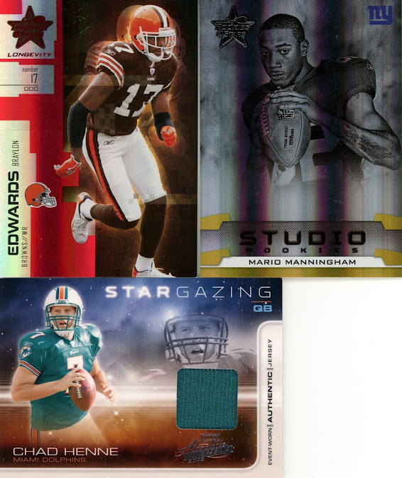 Fellow Michigan fan Chris and I made a nice three-for-three swap that brought me a new Chad Henne hit (#143!) plus numbered inserts of two of his favorite WRs in Edwards and Manningham (you know I can't have too many of him!).Edwards is numbered /249, Mario is /500, and Henne is /250.